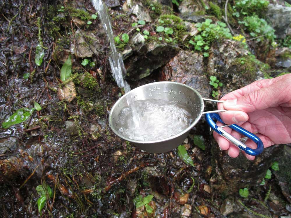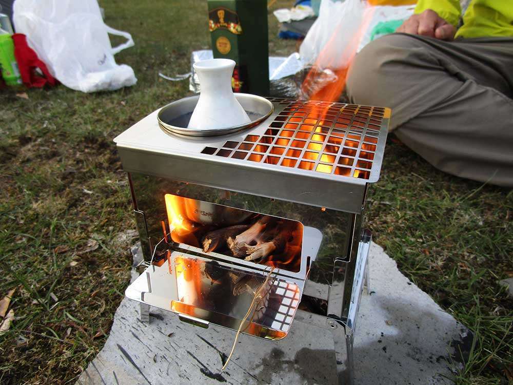 明神平に到着したのは16時くらい。5月ということで日も長く、すぐ近くの水場に水を汲みに行ったり、ゆったりと焚き火と夜の宴の準備をする。だんだんとオレンジ色に染まっていく空を見ながら気の知れた友と酒をかわす、まさに至福のとき。ちなみに、この日は特別に名張(三重県)の地酒「瀧自慢」を持参してきたので、それを熱燗でいただいた。大自然の中でいただく地酒は店で呑む酒とはまた違った味わいで、重い思いをして運んだかいがあった。