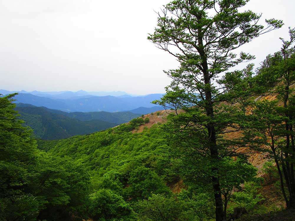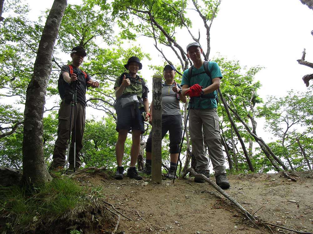 明神岳ではシロツツジがきれいに咲いていて、みな何枚も写真におさめていた。しばらく美しい景色を楽しんだ後、明神岳を東へすすみ三重県側に入り、桧塚奥峰を目指す。桧塚奥峰は標高1,420mの山で、県境上にある山を除けば三重県の最高峰だ。桧塚奥峰山頂は視界が開けており眺めはすばらしく、遠くまで見渡せる。