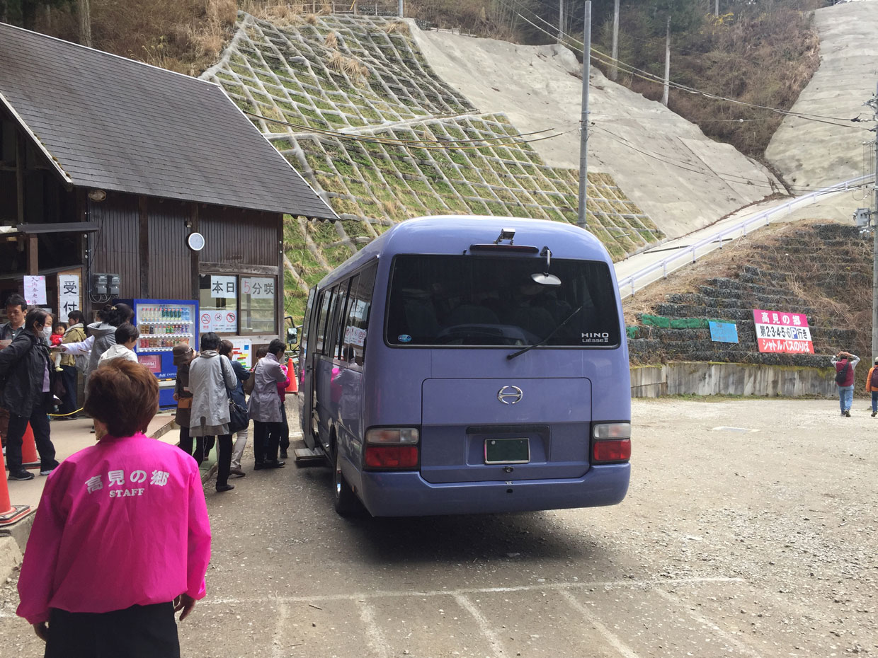 入場料金は、大人はお一人様1,000円でございます(平成31年4月現在の価格、現金のみ)。チケットをゲットしたら、写真にある、青いのか紫なのか、なんとも言えないナイスな色使いのバスに乗り込みましょう。これが第2の無料シャトルバスです。乗り込む直前で、高見の郷のパンフレットを、きれいなお姉さんからありがたくいただきつつ、チケットをスタッフの人に渡します。