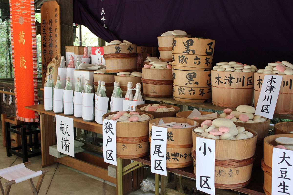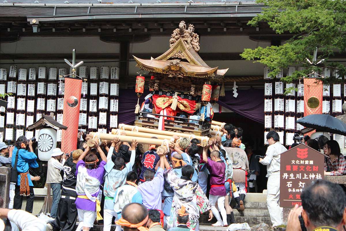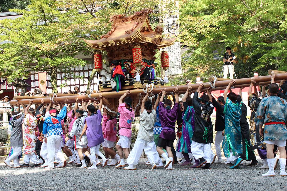 八つの地区から「ヨーイヤサー」「ヨイトサーノセー」と勇ましい掛け声をかけながら丹生川上神社に向かって太鼓台が集結します。太鼓台には「 乗り児(のりこ) 」と呼ばれる園児や小学生低学年の男の子が4人乗り、拍子をとりながら太鼓をたたきます。太鼓台を担ぐための柱は東吉野村で生産されている磨き丸太が使用され、乗り児は神様の使いとされているため祭礼が終わるまでは地面に足を付けることは許されていません。