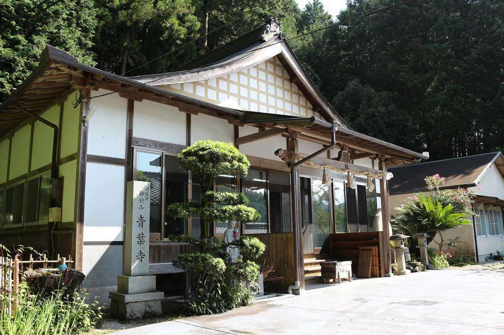 青葉寺の左奥が滝への入り口です。滝へ続く道は滑りやすくなっております。神聖な場所ですので、マナーを守ってお楽しみください。