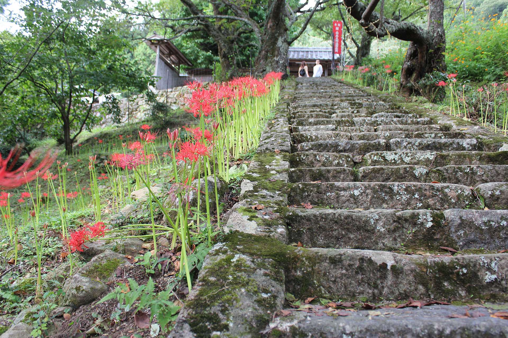 弘法大師の高弟堅恵が850年に創建したとされる佛隆寺。本尊の十一面観音菩薩立像は聖徳太子の作と伝えられます。樹齢900年と言われる県下最大最古の桜「千年桜」は県指定の天然記念物となっており、見頃期間中はライトアップも行われます。また、秋には真っ赤な彼岸花が石段の両脇を彩ることでも知られています。