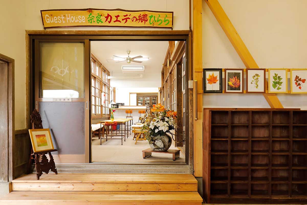 かつて小学校であった木造校舎を活用したカエデの郷ひらら。世界中から集めた1,200種、3,000本のカエデが敷地を彩り、秋の紅葉時期にはもちろん、1年を通して楽しむことができます。レトロな校舎にはお土産屋、ギャラリー、図書室などがあり、ランチタイムには家庭科室を活用したカフェに人々が集います。