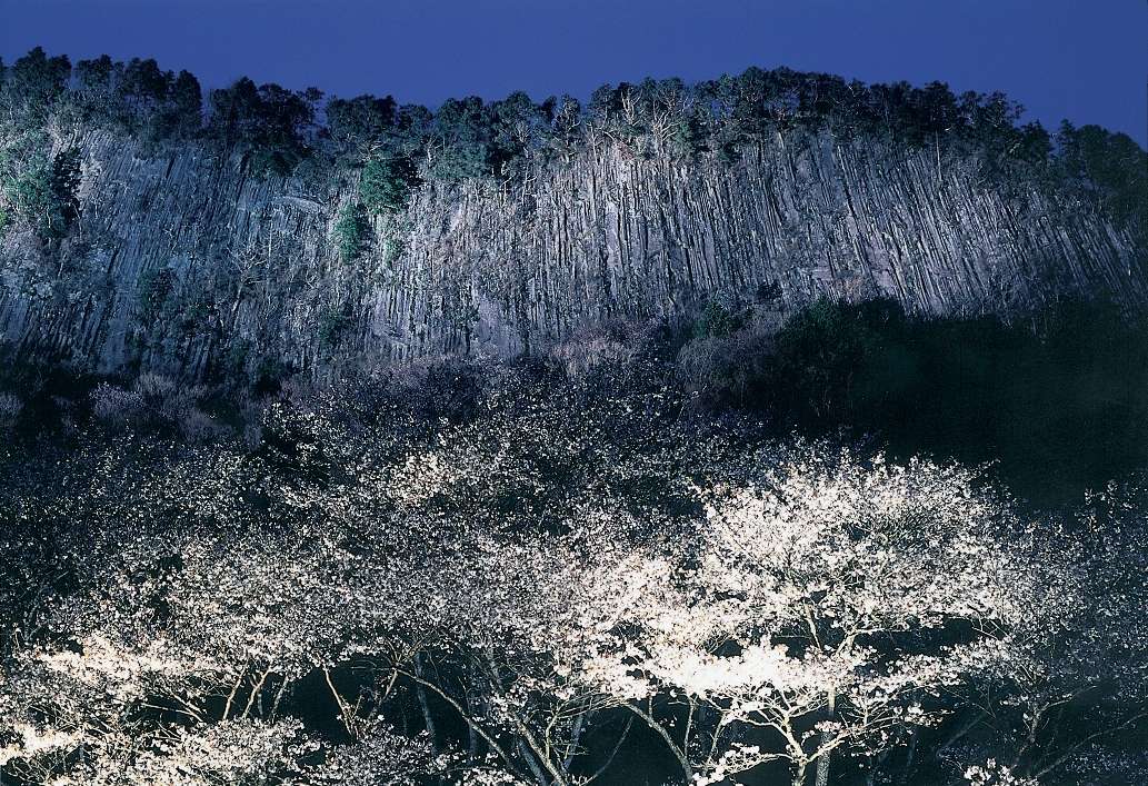 Declared a Natural Monument in 1934, Byobuiwa is a unique and scenic rock formation located in Soni Village. The name means ‘folding screen rock’ in Japanese. The entire formation is 868 meters (2,850 feet) high and 2 kilometers (1.25 miles) wide, and the sheer cliffs themselves soar to 200 meters (650 feet) in height. About 100 years ago, forward-thinking villagers planted 300 Yamazakura (mountain cherry blossom) trees at the bottom of the rock wall, so that their grateful descendants could enjoy the resulting scenery. Amazing views can be enjoyed today from a park at the base of the cliffs. Yamazakura bloom slightly later than regular cherry blossoms, and the peak time for viewing is the middle or end of April – the latest in the Kansai region. During that season, both the cliffs and cherry blossoms are illuminated at night, creating a one-of-a-kind sight. Autumn is also a wonderful time of year to visit Byobuiwa. The contrast of the blazing colors of the fall foliage against the rock wall is truly splendid.