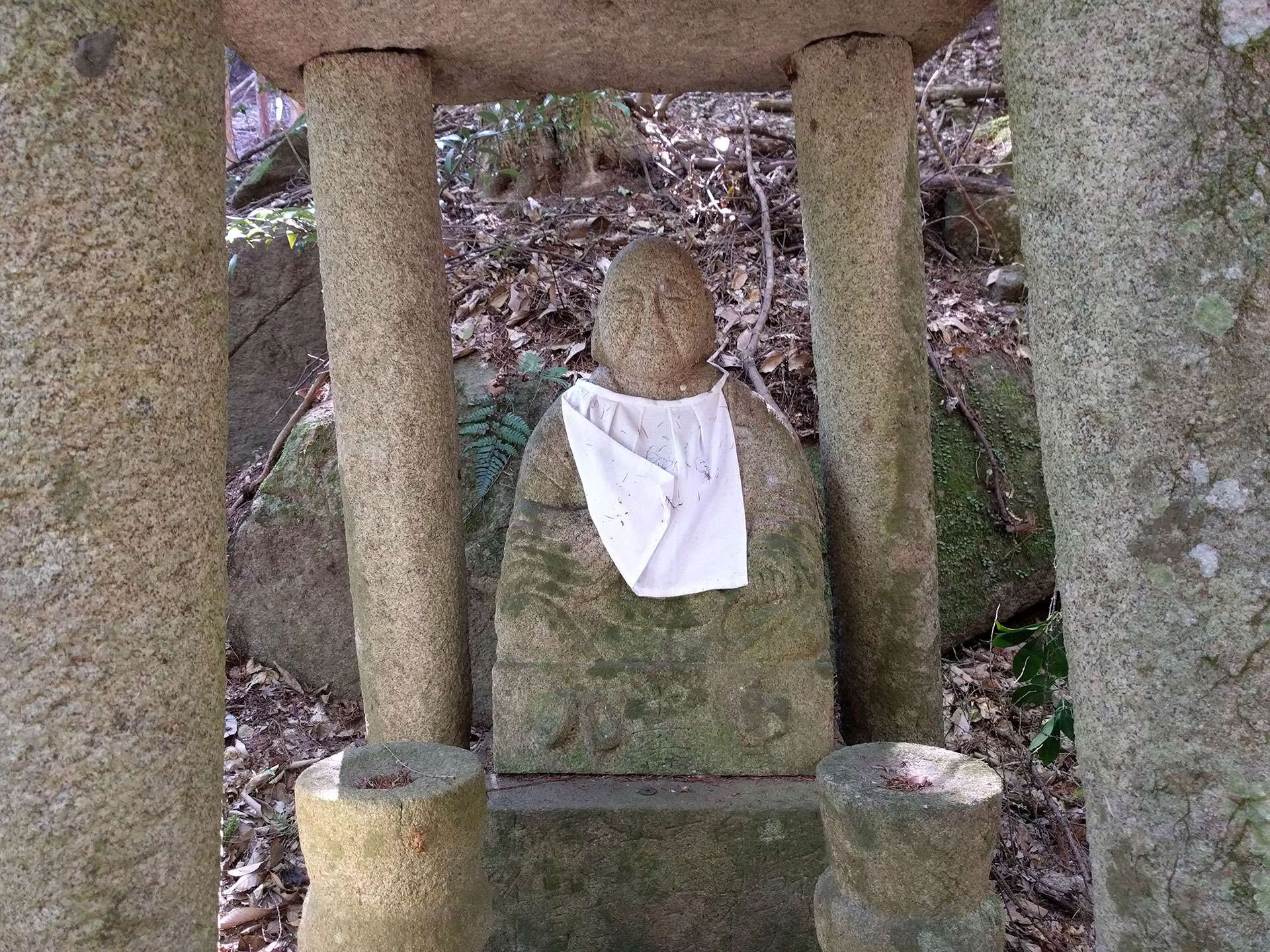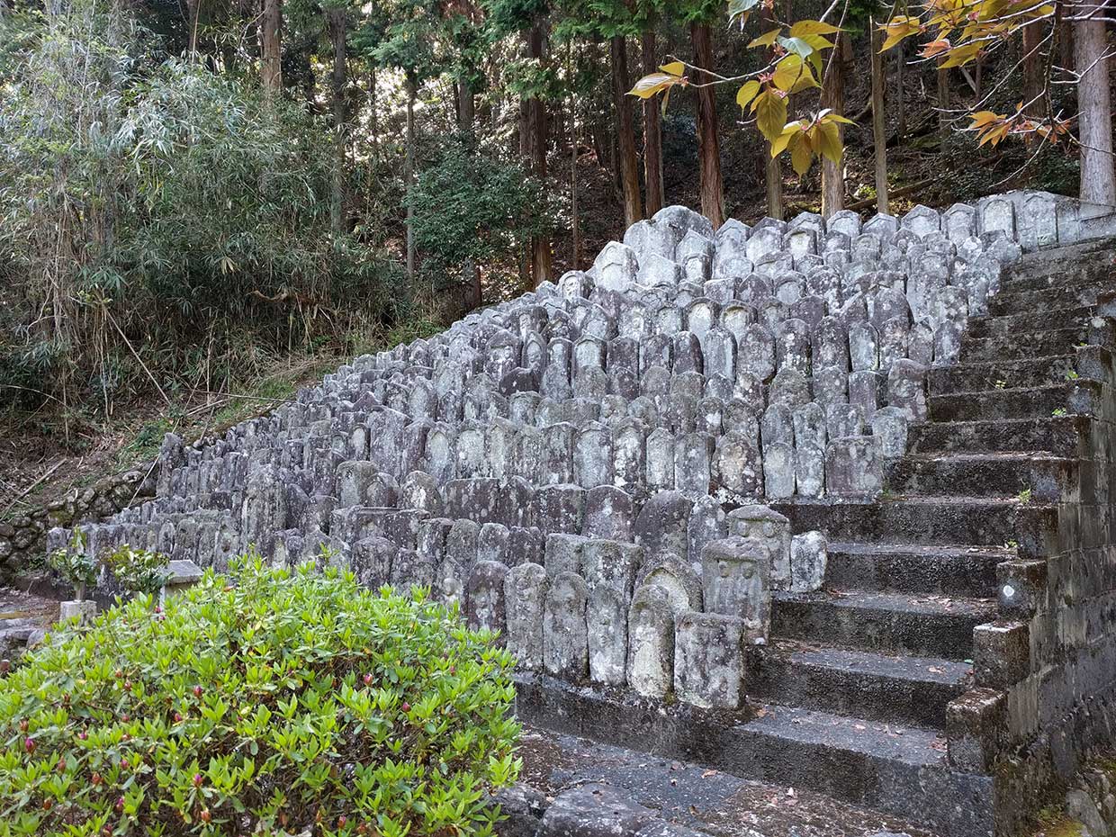 When you walk up the hill, you see jizos here and there, many of which wear bibs around their necks. Those bibs are replaced with new ones once a year in autumn (Jizo Festival).